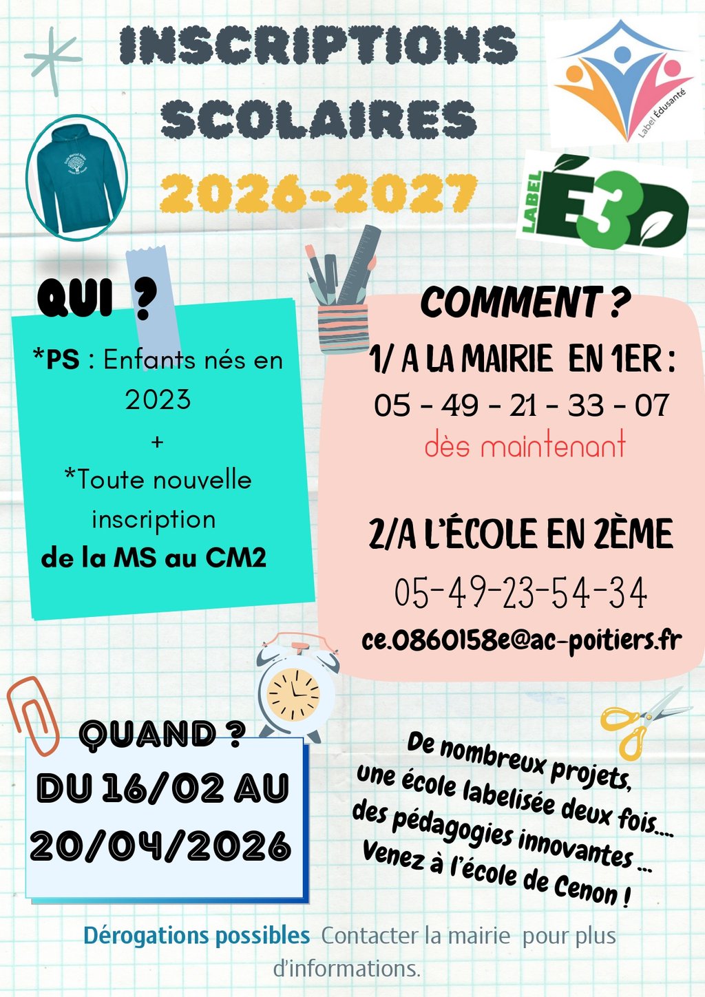 Les inscriptions pour l’année scolaire 2026 sont désormais ouvertes jusqu’au 20 avril 2026.