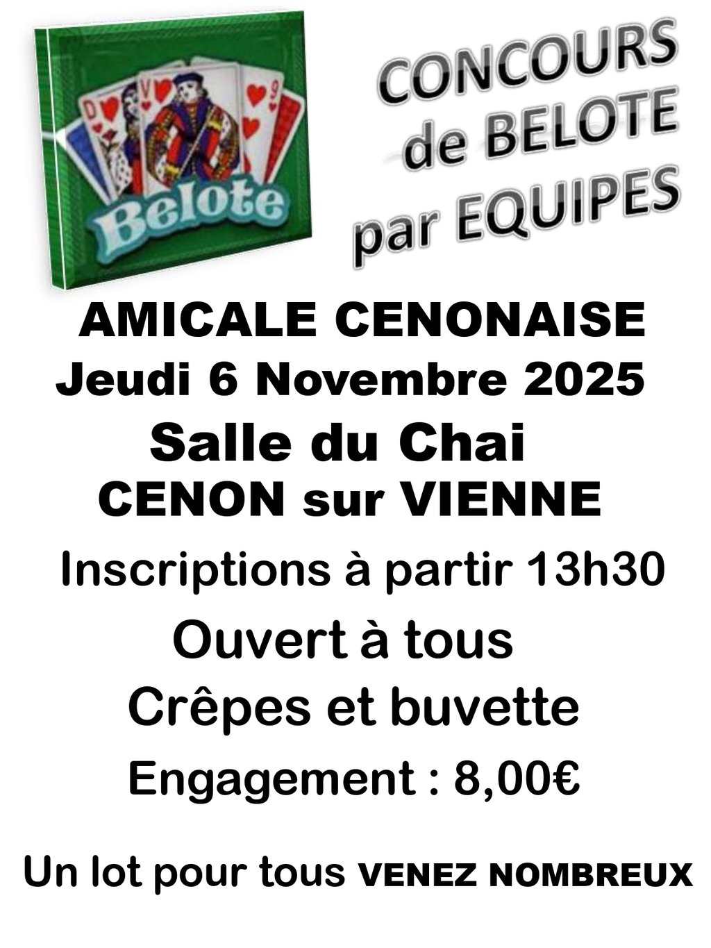 L’Amicale Cenonaise vous invite à son concours de belote par équipes le jeudi 6 novembre 2025 à la Salle du Chai !