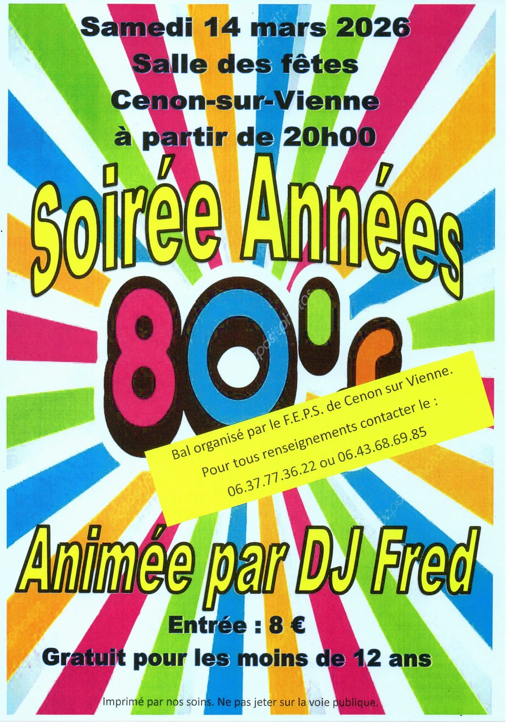 Le samedi 14 mars 2026, rendez-vous à la Salle des fêtes de Cenon-sur-Vienne à partir de 20h00 pour une Soirée Années 80 haute en couleurs !
